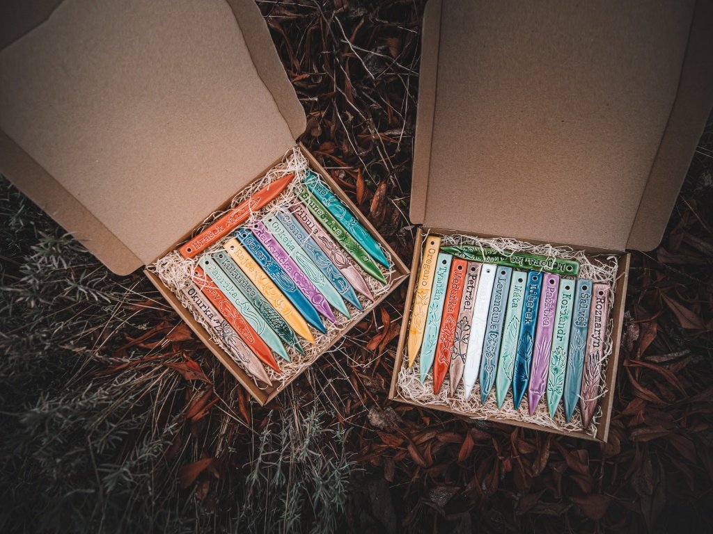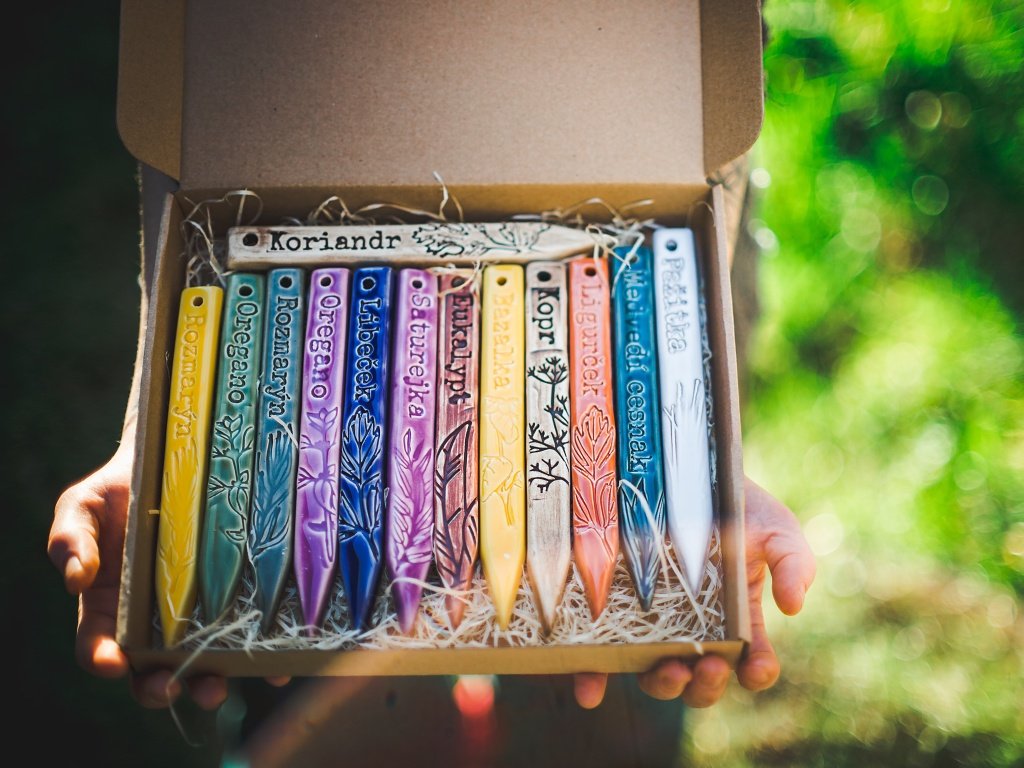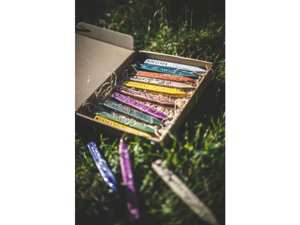 Na druhou stranu keramického zápichu lze tužkou napsat doplňující údaje, jako datum sadby nebo název odrůdy.